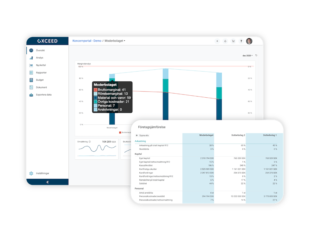 Oxceed är en molnbaserad tjänst som ger företag bättre överblick över sin ekonomi och gör det enkelt att skapa finansiella rapporter och beslutsunderlag. Genom att integrera Oxceed med sitt affärssystem kan företag visualisera och analysera aktuella bokföringsdata i realtid. Oxceed används av företag, koncerner och redovisningsbyråer.