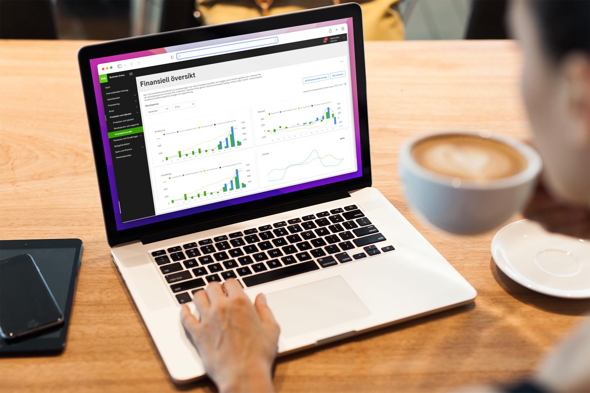 Som företagskund hos SEB kan du följa företagets finansiella utveckling i realtid med visuella grafer direkt i Business Arena. Anslut ditt företag enkelt på bara några minuter.