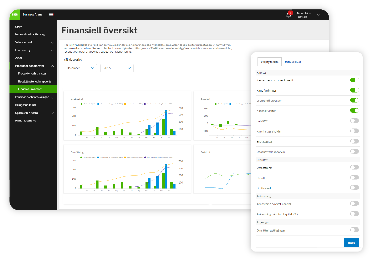 När du har anslutit dig till tjänsten Finansiell översikt kan du följa ditt företags utveckling i realtid med hjälp av visuella grafer direkt i Business Arena. Välj bland 15 nyckeltal för att bevaka de som är mest relevanta för just er verksamhet.