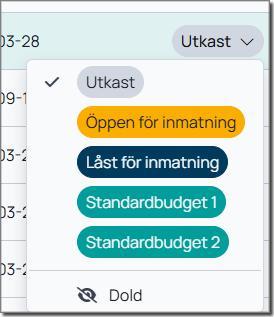 För att kunna justera en budget- eller prognosmall, inklusive att bestämma vilka konton som ska budgeteras på, måste den aktuella budget- eller prognosversionen vara i status “Utkast”. Detta ändrar ni genom att klicka på statusknappen och välja “Utkast”
